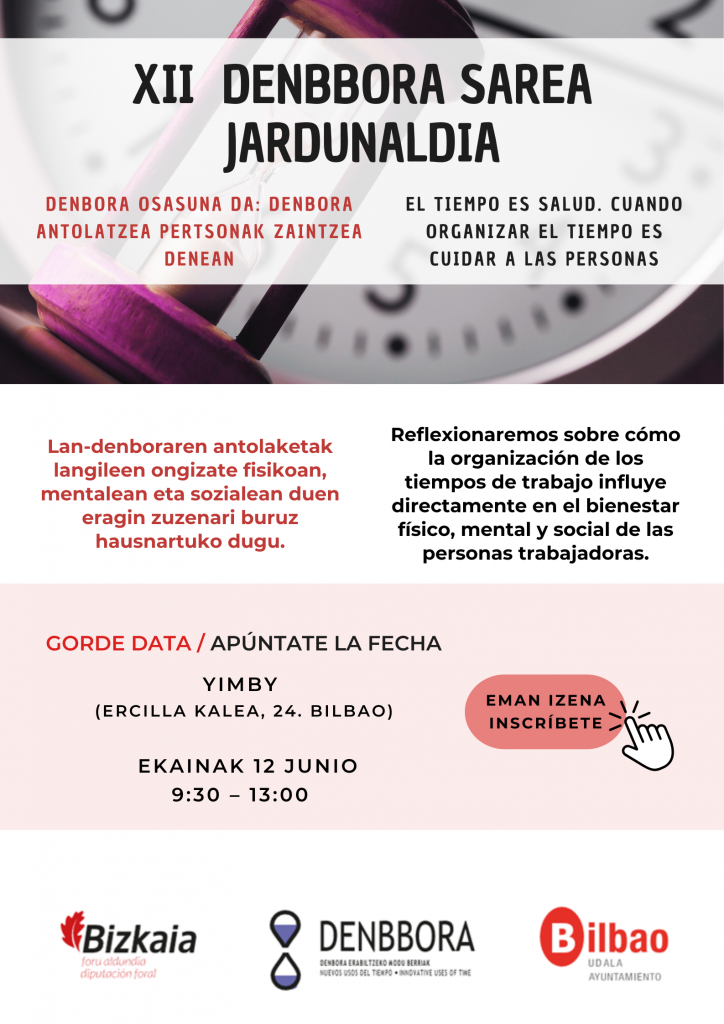 XII. denBBora Sarea Jardunaldia «Denbora osasuna da: Denbora antolatzea pertsonak zaintzea denean» Posted on 22 apirila, 2026 (22 apirila, 2026) by Murgibe 2026ko ekainaren 12a Izena emateko sakatu irudian edo egin klik estekan: IZENA EMAN
